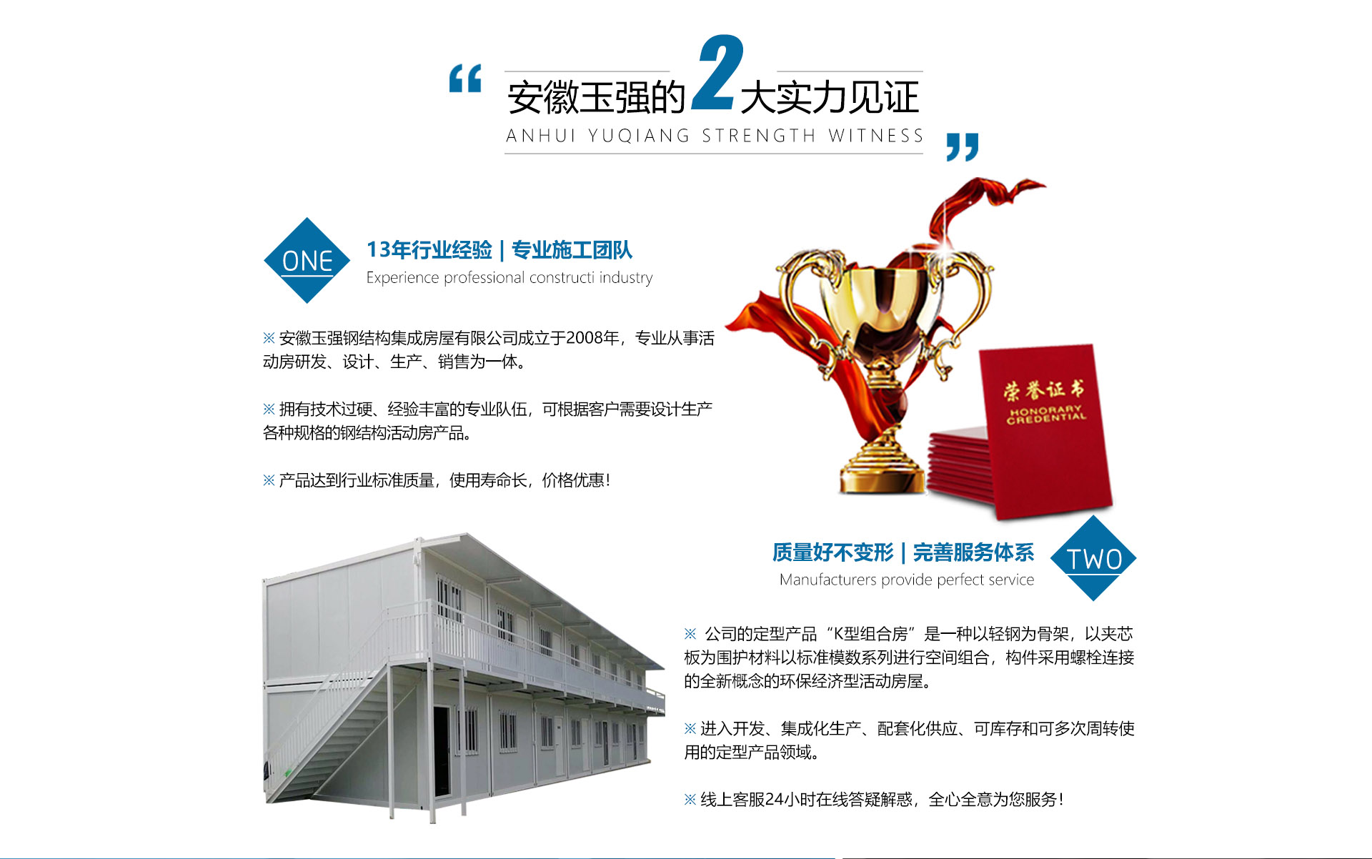 關(guān)于我們安徽玉強(qiáng)鋼結(jié)構(gòu)集成房屋有限公司是一家集研發(fā)、設(shè)計(jì)、生產(chǎn)、銷(xiāo)售服務(wù)于一體的活動(dòng)房與集裝箱制造企業(yè),公司隊(duì)伍具有多年鋼結(jié)構(gòu)制作及產(chǎn)品檢測(cè)經(jīng)驗(yàn),嚴(yán)格按照鋼結(jié)構(gòu)標(biāo)準(zhǔn)要求制作、檢測(cè)。致力于提供研、產(chǎn)、銷(xiāo)、于一體,有著多年積累的先進(jìn)生產(chǎn)技術(shù)和豐富工作經(jīng)驗(yàn),采用精良的工藝技術(shù),生產(chǎn)美觀大方的定型產(chǎn)品,長(zhǎng)期以來(lái),受廣大用戶(hù)的信賴(lài)和支持。歡迎您的來(lái)電咨詢(xún)。